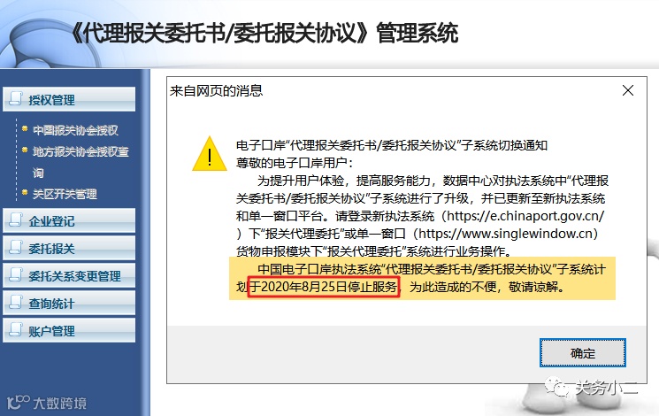 中国电子口岸执法系统“代理报关委托书/委托报关协议”子系统计划于2020年8月25日停止服务,为此造成的不便,敬请谅解。