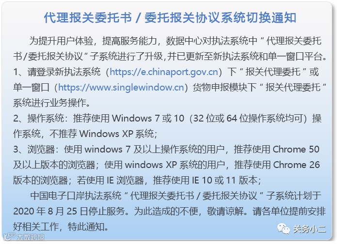为提升用户体验,提高服务能力,数据中心对执法系统中“代理报关委托书/委托报关协议“子系统进行了升级,并已更新至新执法系统和单一窗口平台。