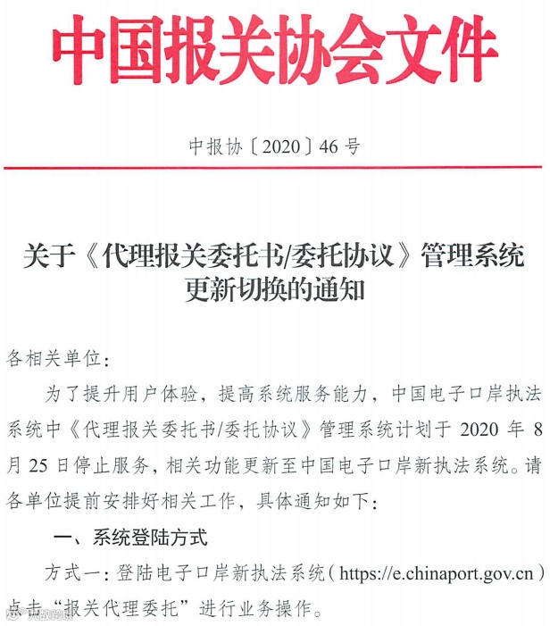 中国报关协会关于《代理报关委托书/委托协议》管理系统更新切换的通知: