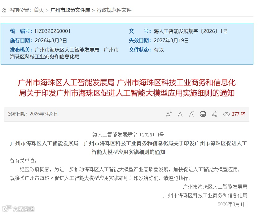 为加快海珠区人工智能大模型产业高质量发展,就培育行业大模型优势产业集群、构建环海珠湿地创芯价值圈和打造数字人才集聚高地,根据广州市相关政策文件,制定本实施细则。
