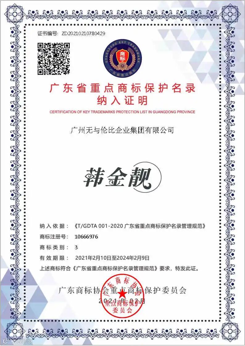 近日,广东商标协会重点商标保护委员会公布2020年度广东省重点商标保护名录纳入名单。广州无与伦比企业集团旗下品牌——韩金靓被纳入首批广东省重点商标保护名录,一同公布的还有华为、格力GREE、中国平安、王老吉等792个知名品牌。