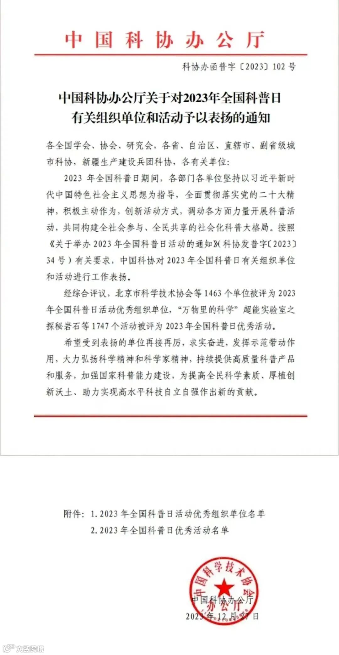 近日,中国科协公布2023年全国科普日考核结果,对有关组织单位和活动予以表扬,由广州市科协、广东省科学院等19家单位在广科琶洲科普文创园的公共服务平台——广东省科学院琶洲科普小镇联合举办的 “2023年广州市全国科普日主场活动暨第六届广州科普嘉年华”入选“2023年全国科普日优秀活动”。