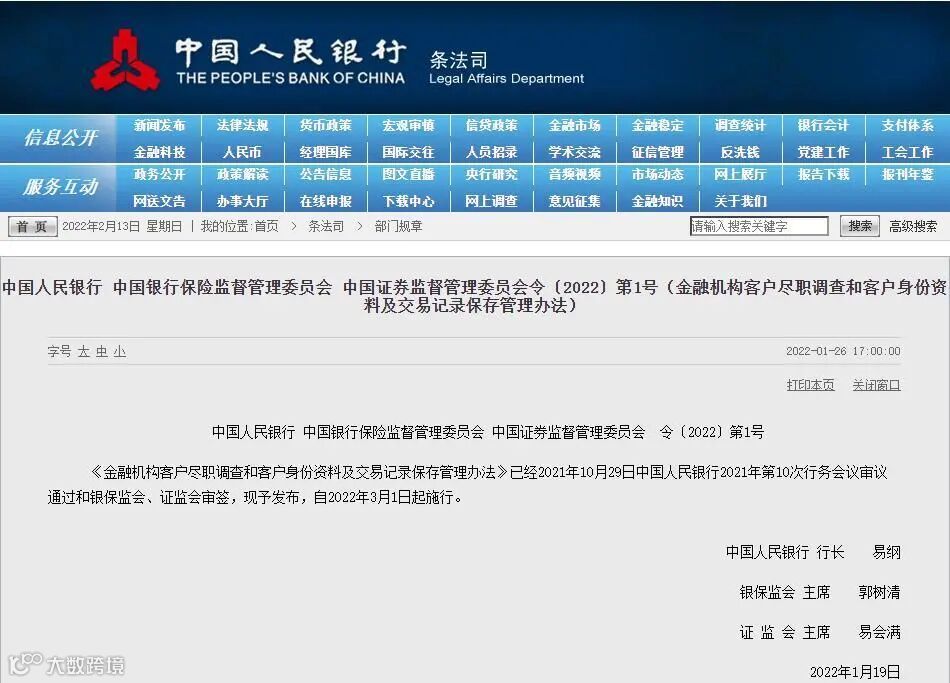 该办法自2022年3月1日起施行,主要内容是规范金融机构的客户尽职调查、客户身份资料及交易记录保存行为。《办法》提到,商业银行、农村合作银行、农村信用合作社、村镇银行等金融机构为自然人客户办理人民币单笔5万元以上或者外币等值1万美元以上现金存取业务的,应当识别并核实客户身份,了解并登记资金的来源或者用途。