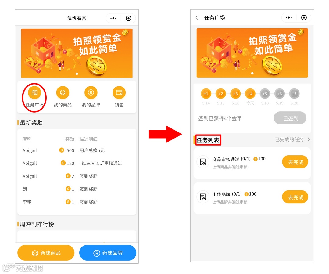 在首页最下方,点击【新建商品】或【新建品牌】即可拍照上传提交审核,在审核通过后系统将自动发放相应奖励金币。