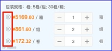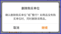 商品模块中,点击购买单位行左侧的删除按钮,弹出弹窗,确认后将删除整行购买单位。