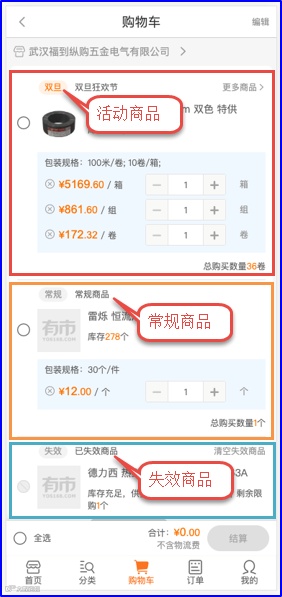 购物车商品排序调整,从上往下依次调整为活动商品>常规商品>失效商品,方便清晰查询商品信息。