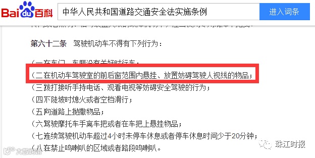 其中,《中华人民共和国道路交通安全法》实施条例第六十二条明确规定:在机动车驾驶室的前后窗范围内(包括后视镜),只要是放置或者是悬挂有可能影响驾驶人视线的物品都属于违法行为。