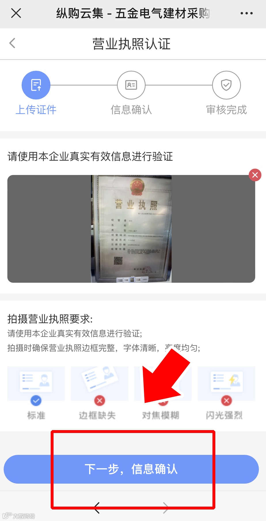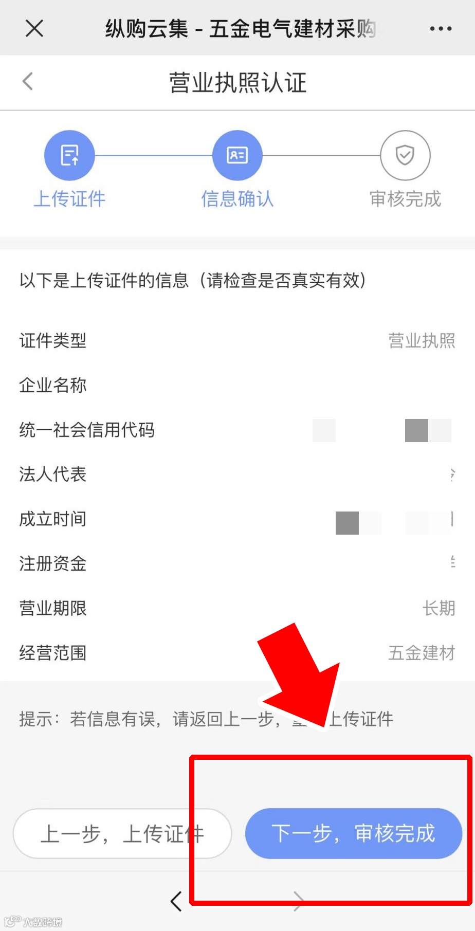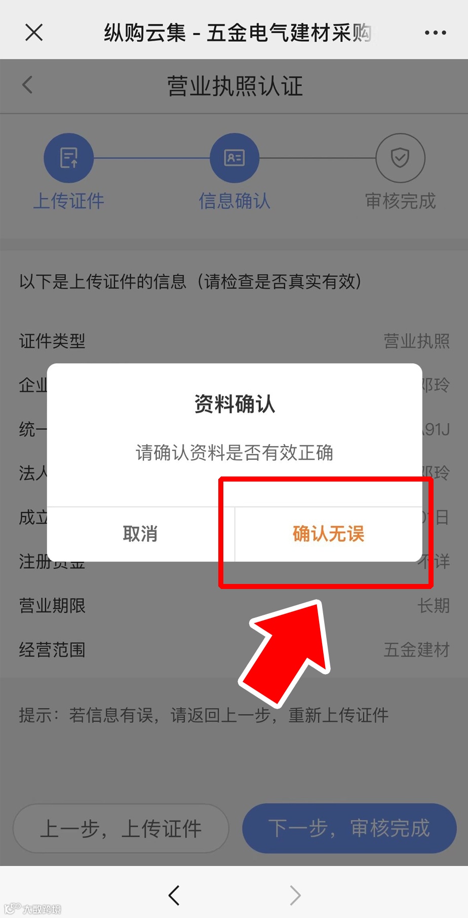 证件上传完成后,点击【下一步,信息确认】,核对信息,点击【下一步,审核完成】→【确认无误】;