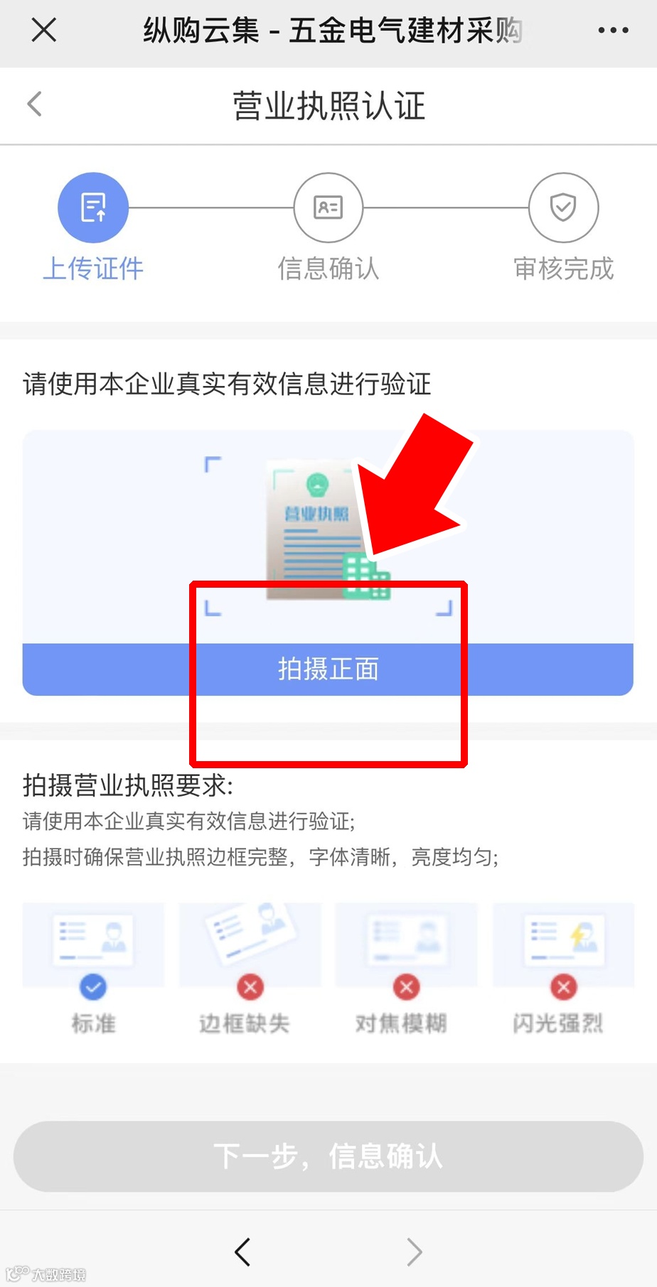 点击【开始认证】→【拍摄正面】,按照要求上传证件照片;