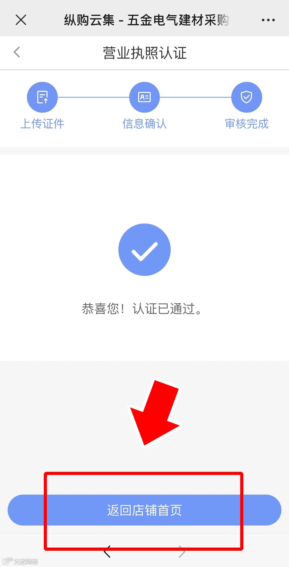 页面显示【恭喜您!认证已通过。】后,可点击【返回店铺首页】,