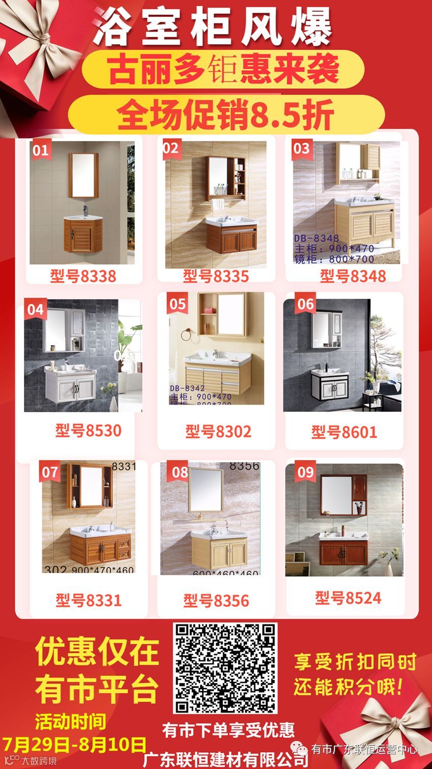古丽多浴室柜,全场8.5折,平台下单享受折扣优惠,还能积分兑换礼品哦!超值特惠,不容错过,赶紧抢购吧.......