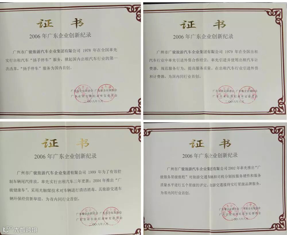 率先实行“扬手即停”服务、率先使用计价器、率先推出“广骏服务星级旅程”、率先实行出租车三年更新、首推光触媒消毒技术的“广骏健康车”等均获得了广东企业创新记录奖,受到了社会各界的认可与好评。广骏一直以荣誉为动力,多年来用心做好出租车服务工作,满足每一位乘客的用车需求!