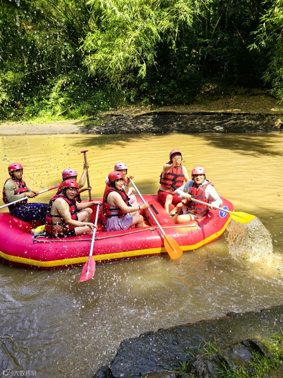 他们在海神庙前合影留念,换上纱笼参观气势恢宏的乌布皇宫,在阿勇河漂流,坐香蕉船出海,尽情放松。