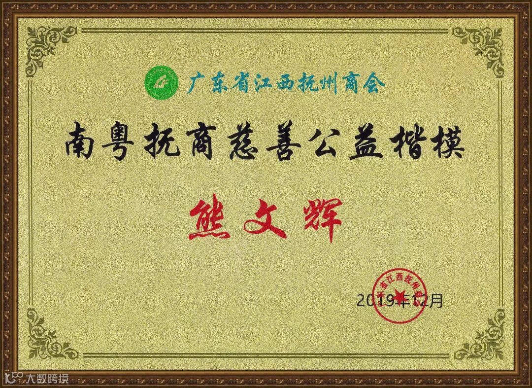 抚州商会会长、家和集团董事长熊文辉荣获由大会授予的“南粤杰出抚商”、“南粤抚商慈善公益楷模”称号。