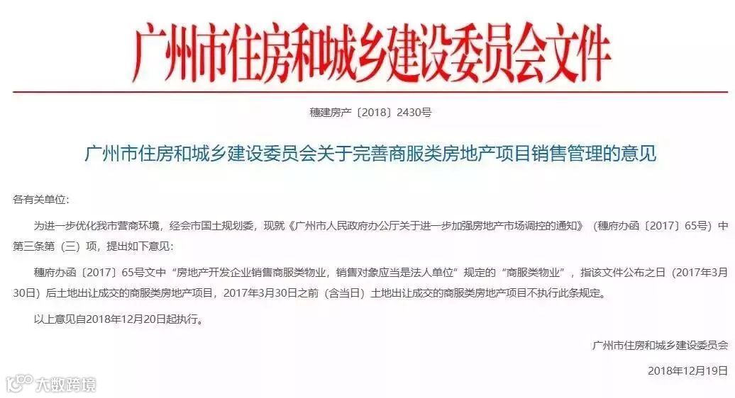 2018年12月19日,广州住建委发问正式表示,330新政出让的土地,商服类物业均可卖给个人!自2018年12月20日起执行!以下为《广州市住房和城乡建设委员会关于完善商服类房地产项目销售管理的意见》文件的解读。