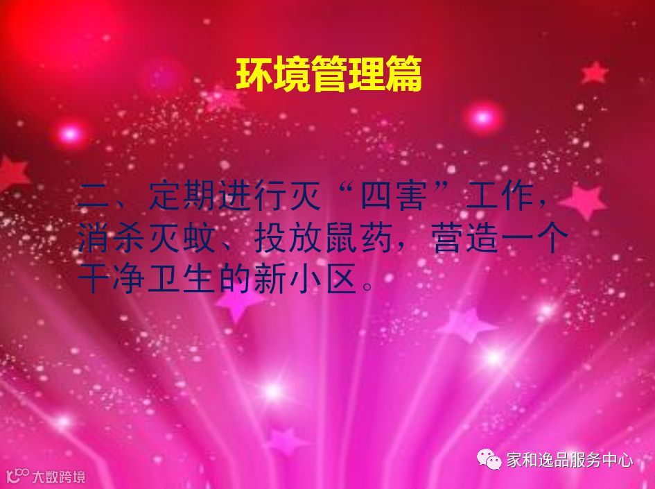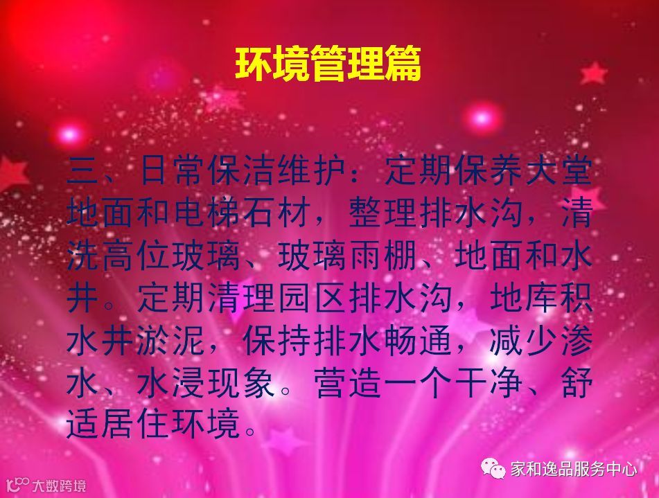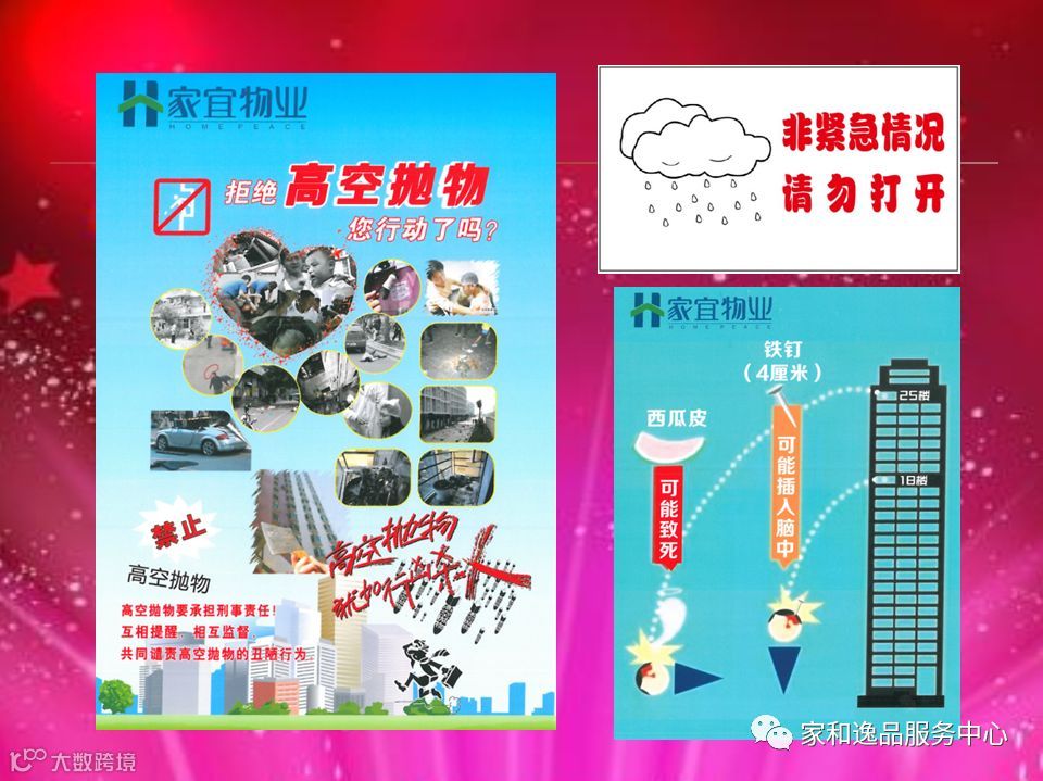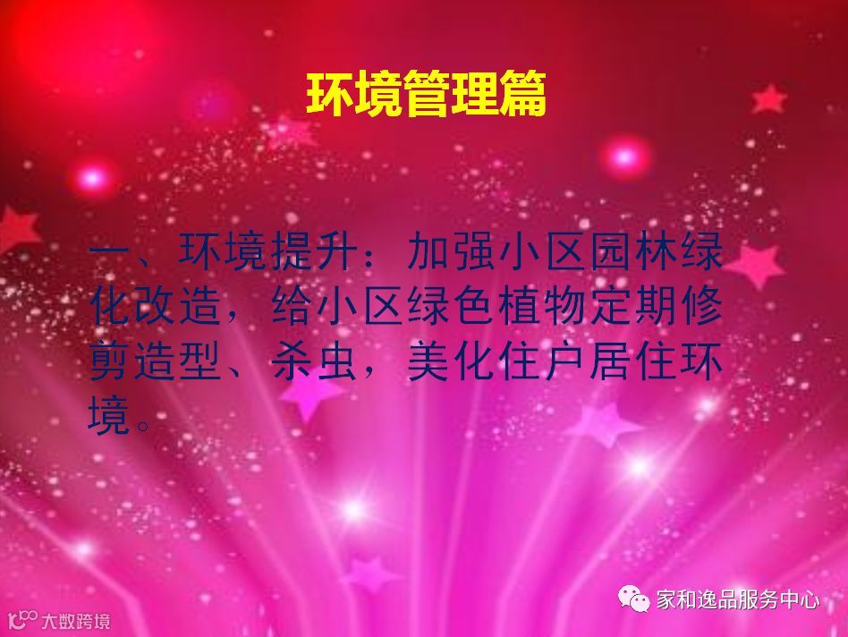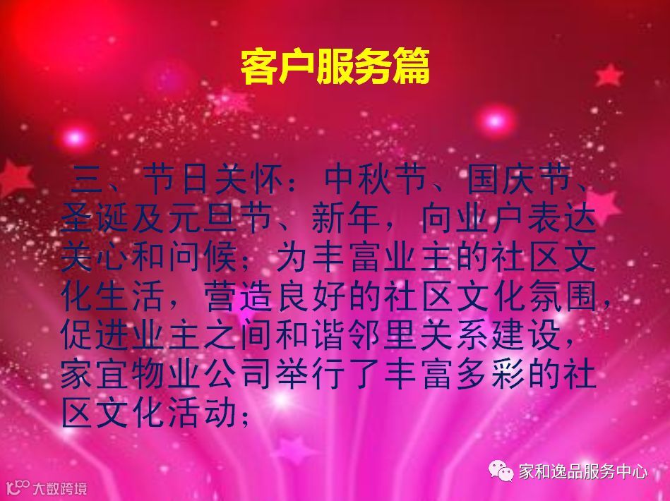 即将过去的一年,承蒙各位业主对家宜物业工作的理解、关心和大力支持,使得物业工作如期完成了目标要求。这一年,家宜物业拓展了市场,使家宜物业在同行中赢得了应有的声誉。在此家宜物业向您和您的家人表示衷心的感谢!并请你们不吝赐教,今后多给我们的工作提出宝贵的意见。