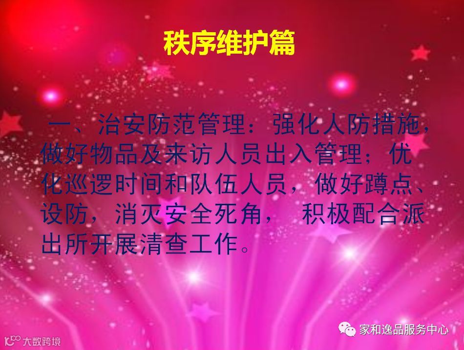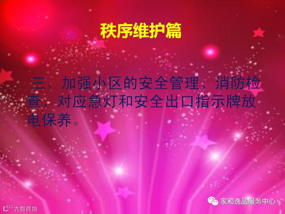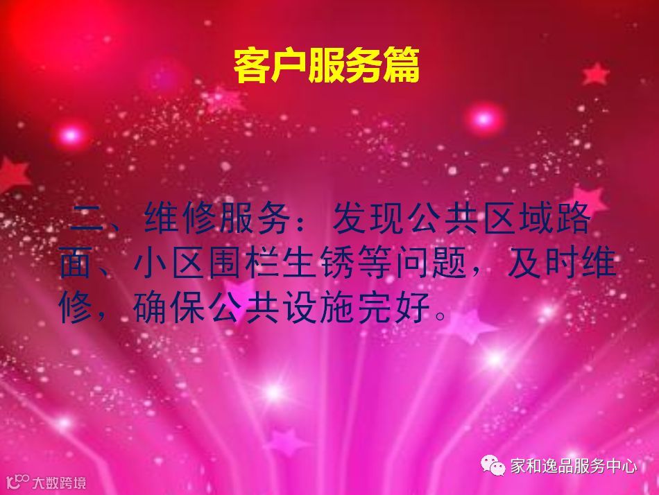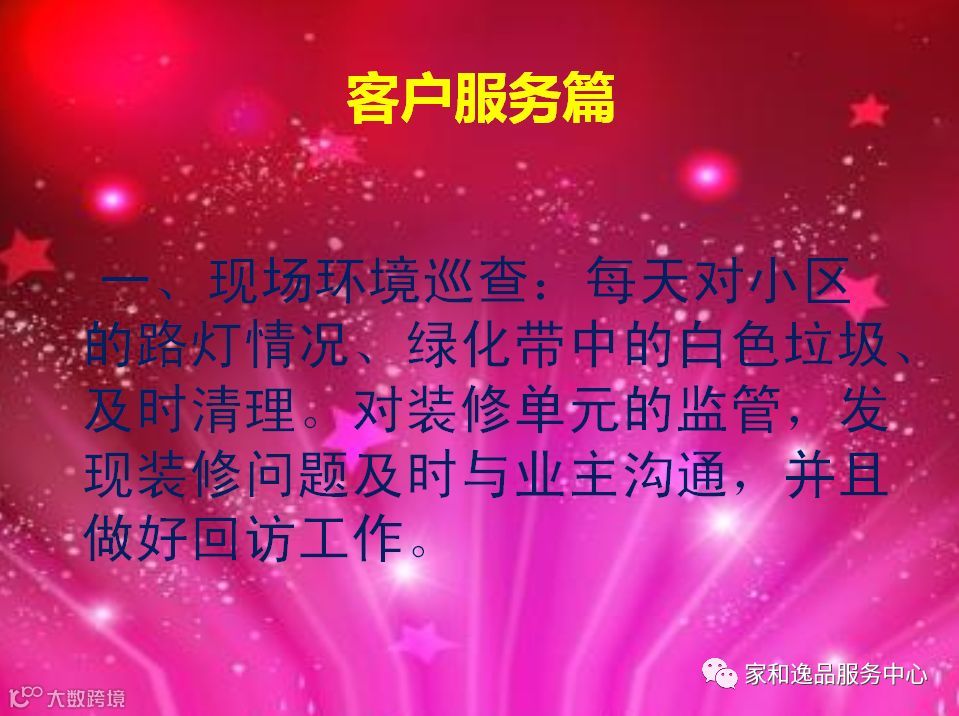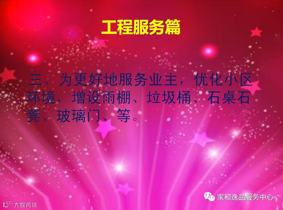 即将过去的一年,承蒙各位业主对家宜物业工作的理解、关心和大力支持,使得物业工作如期完成了目标要求。这一年,家宜物业拓展了市场,使家宜物业在同行中赢得了应有的声誉。在此家宜物业向您和您的家人表示衷心的感谢!并请你们不吝赐教,今后多给我们的工作提出宝贵的意见。