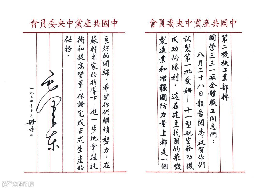 ·1954年8月,中国第一台M-11型航空发动机在国营三三一厂(南方宇航前身企业)制成,毛泽东同志亲笔嘉勉。