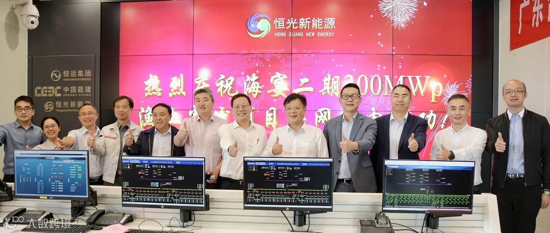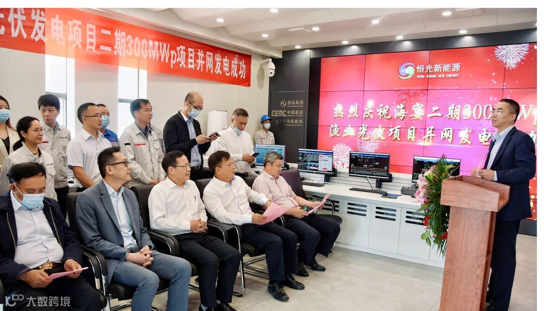 2022年4月9日,广东台山海宴二期300MWp渔光互补项目正式并网发电,首次投产28MWp。集团副总经理周水良、中国能建广东院副总经理陈澜、中国银行股份有限公司广州珠江支行行长陈穗勇、恒新能源公司董事长吕继光等参加并网发电活动。