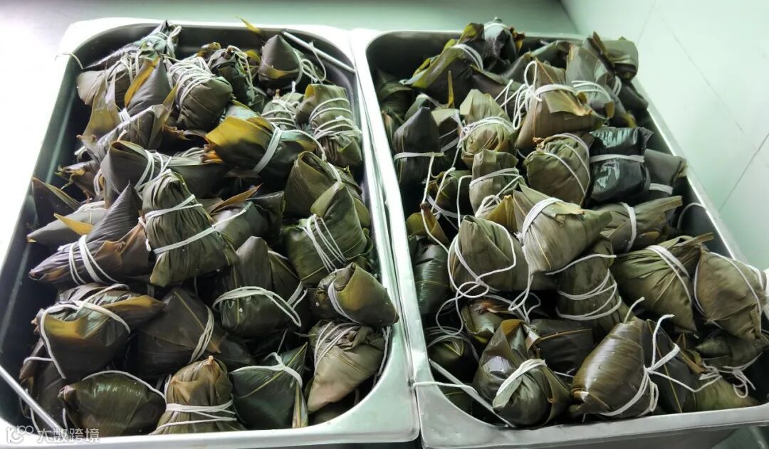6月19日下午,一切准备就绪,在完成当日繁重的供餐任务之后,恒城服公司的饭堂师傅们纷纷主动请缨,齐上阵,牺牲休息时间加班加点包粽子。大家热情高涨,分工有序,新手们边看边模仿,活学活用,来回地操纵着手中的粽叶和线,上手起来丝毫不逊色,将丰富的馅料与节日的祝福紧紧包裹,忙得不亦乐乎。很快,一堆堆色泽鲜艳、棱角分明的粽子展现在大家面前。