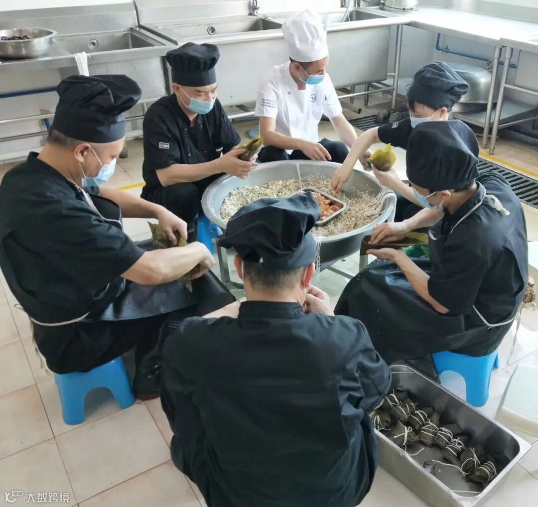 包粽子是个技术活,在短时间内包好成百上千个粽子,这显然对饭堂的工作人员来说是项极大的考验。一周前,恒城服公司便开始张罗,提前采购粽叶、糯米、绿豆等原材料,并将肉类食材腌制待用。