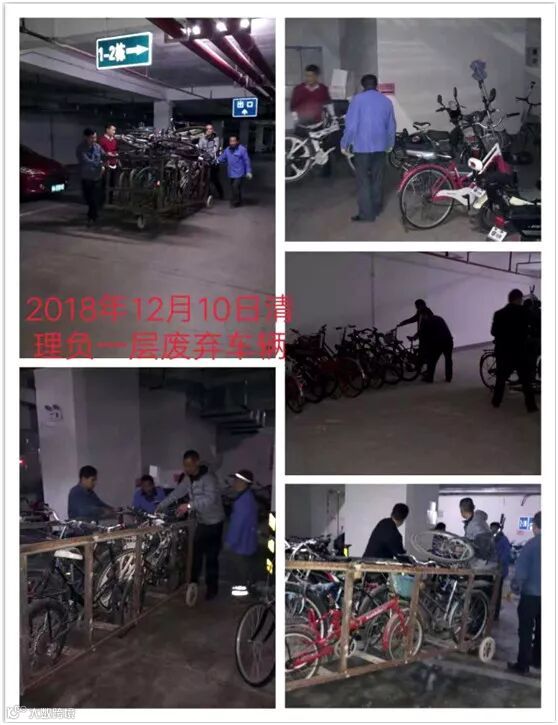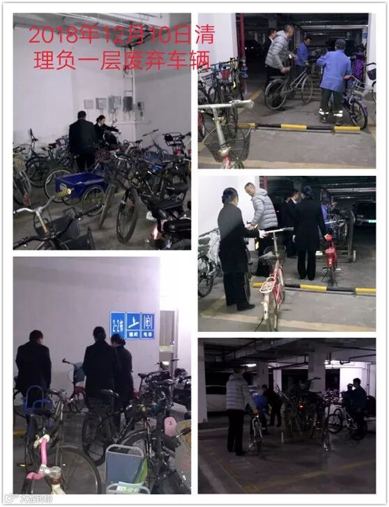 在负一层非机动车停放点放置部分闲置废弃的“僵尸车”,由于车辆长时间无人认领使用,长期占用公共车辆停放位置及消防通道。为充分利用小区公共停车资源及杜绝消防安全隐患,我物业公司进行了清理“僵尸车”行动。