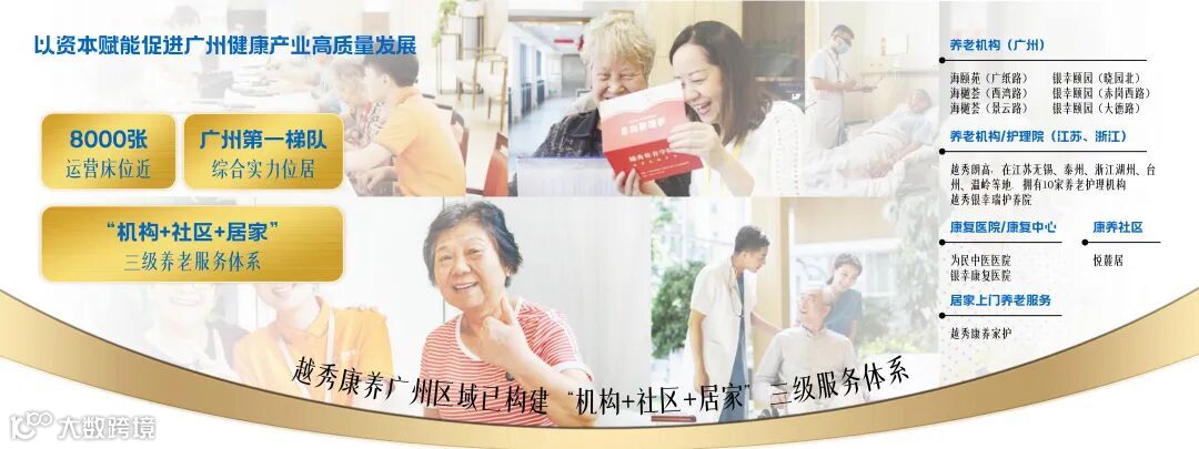• 越秀康养以“养老+医疗”双轮驱动,构建“机构+社区+居家”三级养老服务体系,运营床位近8000张,综合实力位居广州第一梯队。