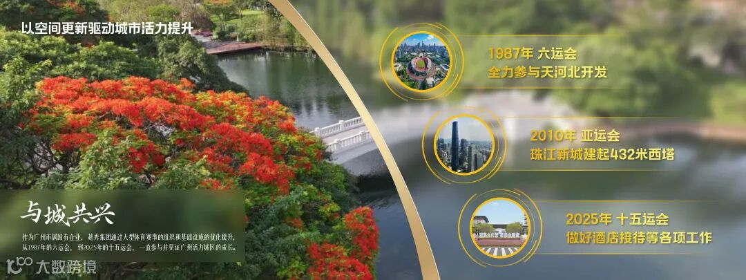 • 六运会,越秀负责天河体育中心及周边道路、公建设施的综合开发,助力天河商圈从“城市新区”成长为“城市中心”。