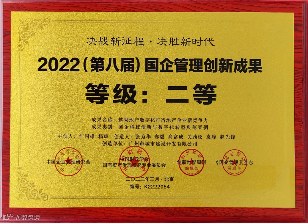 3月25日,在2023国企管理智库大会暨第八届“国企管理创新成果”发布仪式上,越秀地产数字化建设创新成果《越秀地产数字化打造地产企业新竞争力》作为国企科技创新与数字化转型典范案例,经专家评审委员会初审、复审以及大众网络投票等多轮环节,从全国4300多项成果(案例)中脱颖而出,摘得2022国企管理创新成果二等奖。