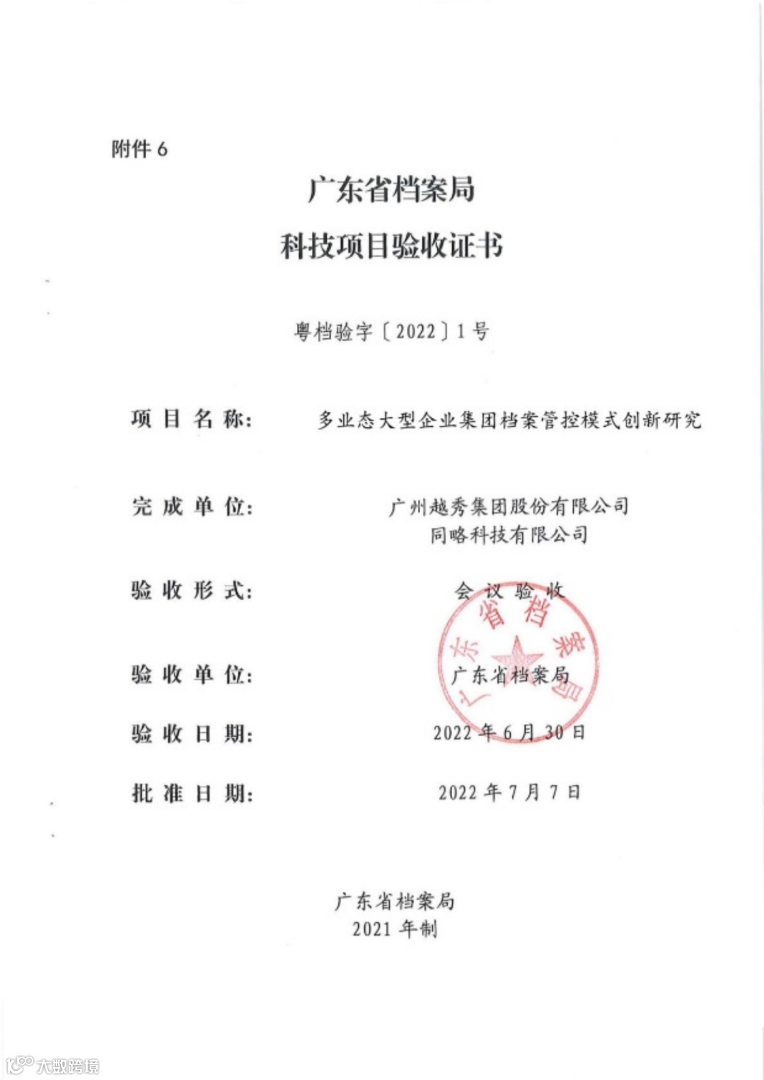 近日,集团总部《多业态大型企业集团档案管控模式创新研究》项目和越秀地产《基于人工智能的房地产项目档案全生命周期管理及应用研究》项目通过省档案科技项目验收,两个项目获得专家组充分肯定,成为省档案局科技项目管理办法修订后首批通过科技验收的项目。