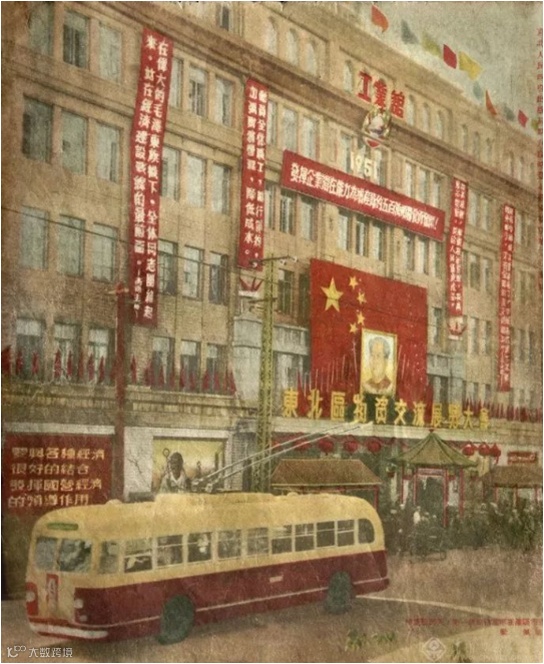 ▲1951年国庆节第一辆无轨电车在沈阳市中山路通行