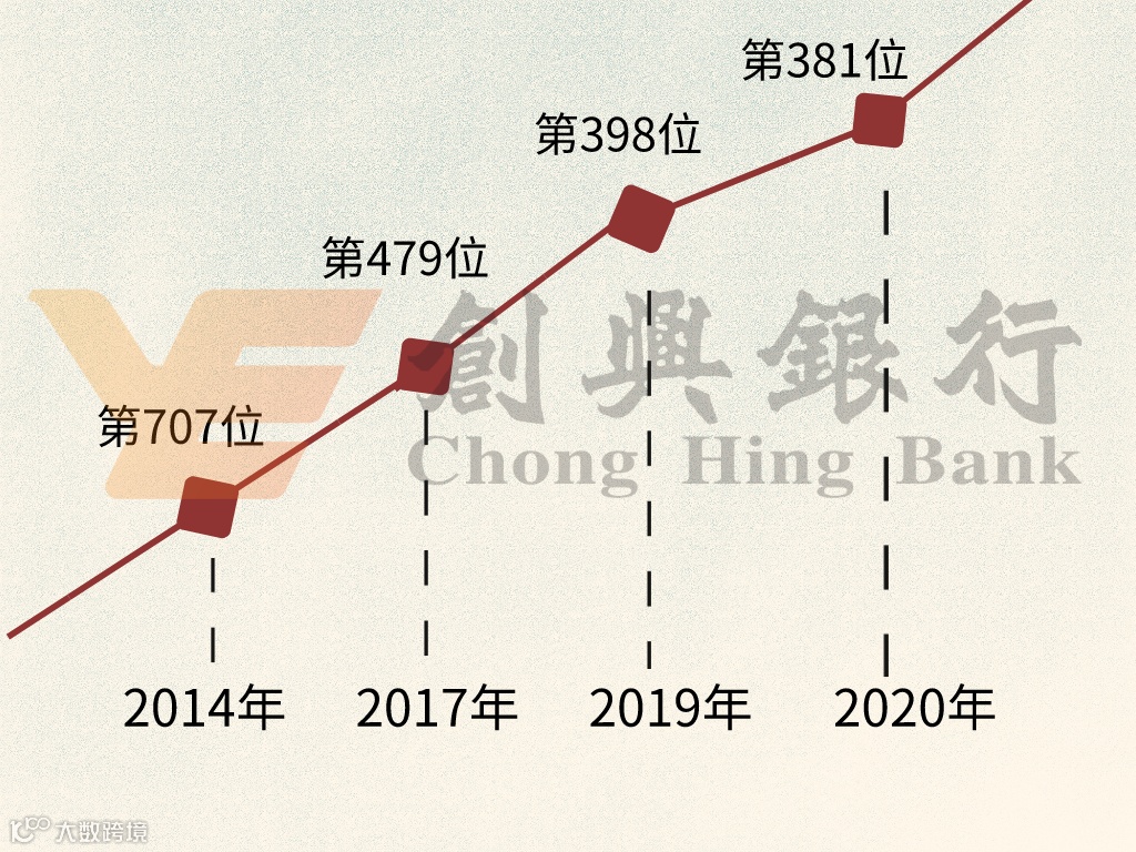 继去年首次跻身排名榜前400强,创兴银行今年进一步攀升至第381位,较去年上升17位。创兴银行已连续多年入选“全球银行1000强”榜单,经过不断的拼搏,10年间排名跃升了306位,显示综合实力显著提。