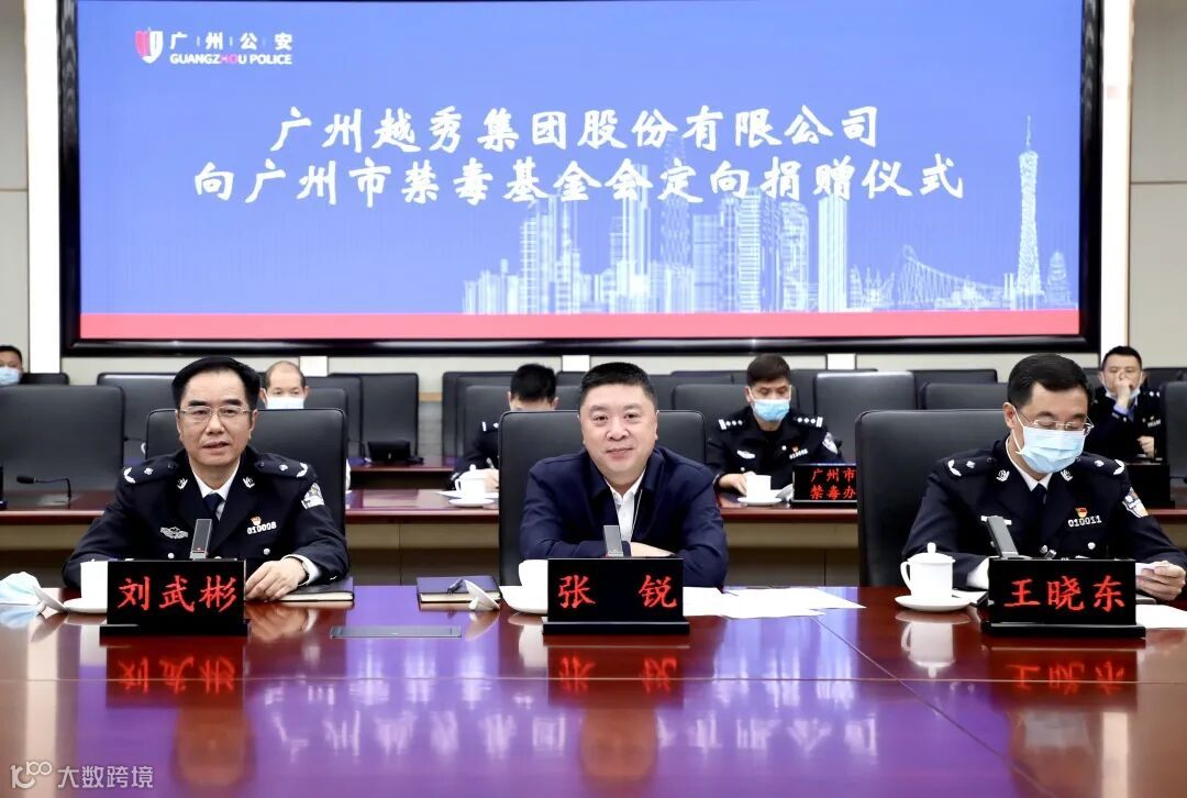 3月30日下午,越秀集团向广州市禁毒基金会定向捐赠仪式于广州市公安局指挥中心举行。副市长、市禁毒委第一副主任、市禁毒办主任、市公安局局长张锐出席仪式并讲话,市禁毒委副主任、市禁毒办常务副主任、市公安局副局长刘武彬主持仪式,市公安局副局长王晓东,越秀集团党委书记、董事长张招兴,副总经理谭思马,首席财务官、越秀集团公益基金会理事长陈静等集团领导,市禁毒基金会秘书长李映辉,市禁毒办以及市公安局相关警种负责同志出席捐赠仪式。