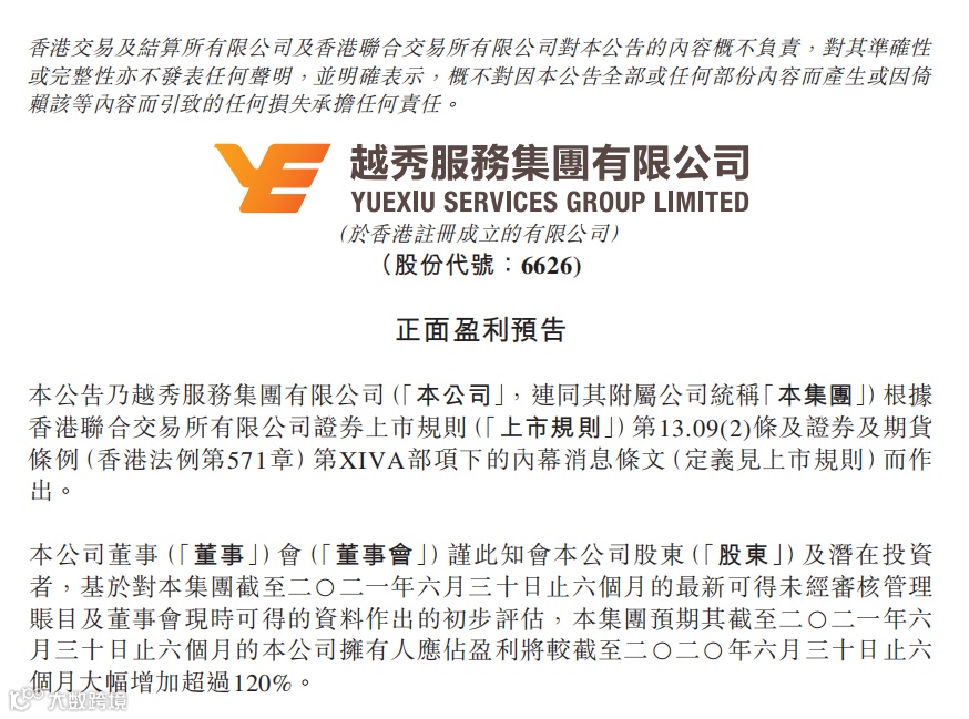 7月15日,越秀服务集团有限公司(6626.HK)发布盈利预喜公告。公告称经过初步评估,集团预期截至2021年6月30日为止的六个月,公司拥有人应占盈利将同比大幅增加超过120%。