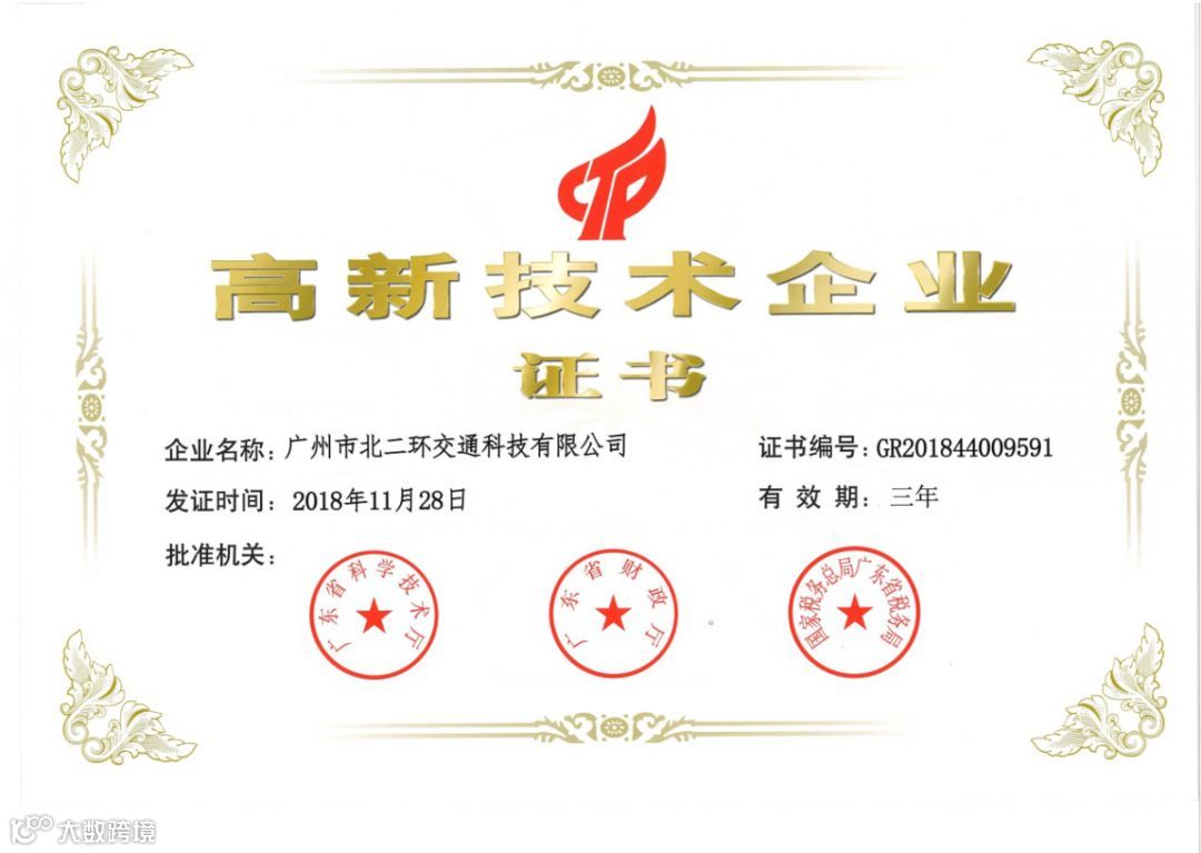 凭借优异的技术创新成果及卓越的应用转化能力,近日,广州市北二环交通科技有限公司高新技术企业申报工作成功获得了科技部官方认定,获颁“高新技术企业证书”,成为交通行业、市属国企为数不多的高新技术企业之一。
