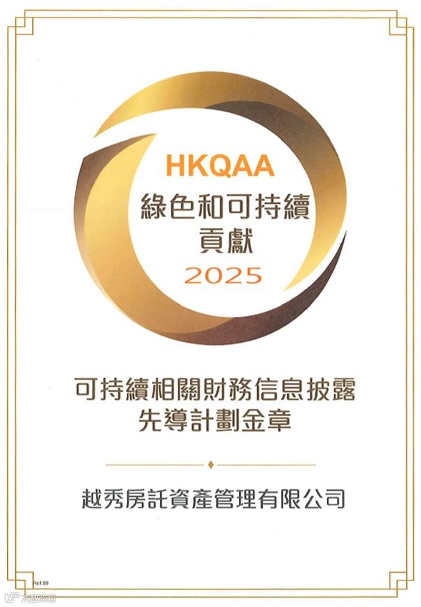 越秀房产基金将ESG可持续发展理念深度融合至发展战略。截至目前,越秀房产基金建立了由董事会领导的ESG管治架构,将ESG标准整合至日常营运,持续提升ESG信息披露水平和透明度;主动深化气候风险管理,探索建立ESG财务影响指标体系;累计发布九份《环境、社会及管治报告》(简称“ESG报告”),并于2025年5月获HKQAA颁发“可持续相关财务信息披露先导计划金章”。