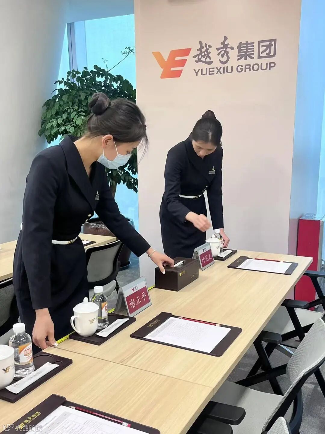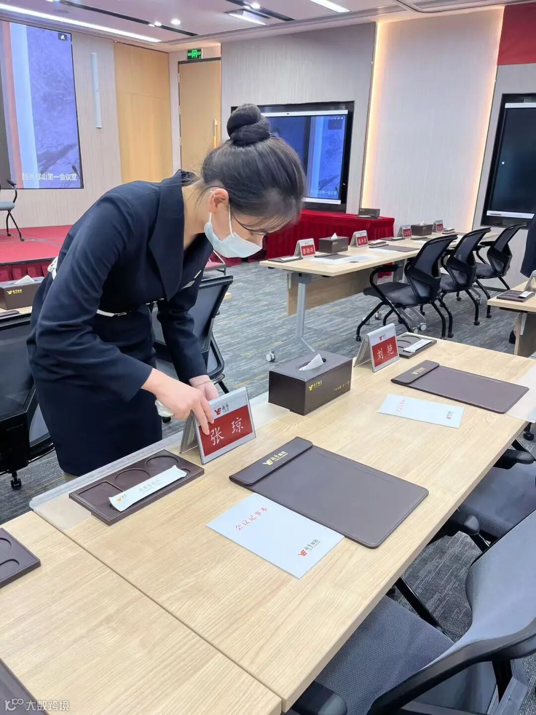 原集团会议布场耗时较长,主要因为桌面物品摆放花费大量时间,且容易出现会议桌面物品摆放不整齐、不统一的情况,需要两人用卷尺慢慢反复调整对齐;一场百人左右的会议,需要4个人布场两小时。