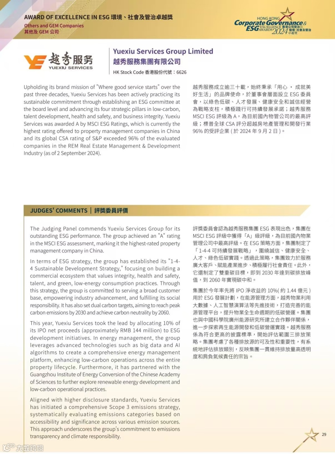 此外,越秀服务还获得了“最佳ESG报告大奖”和“ESG最佳表现大奖”,该奖项属“小型市值上市公司”组别中的最高级别荣誉。