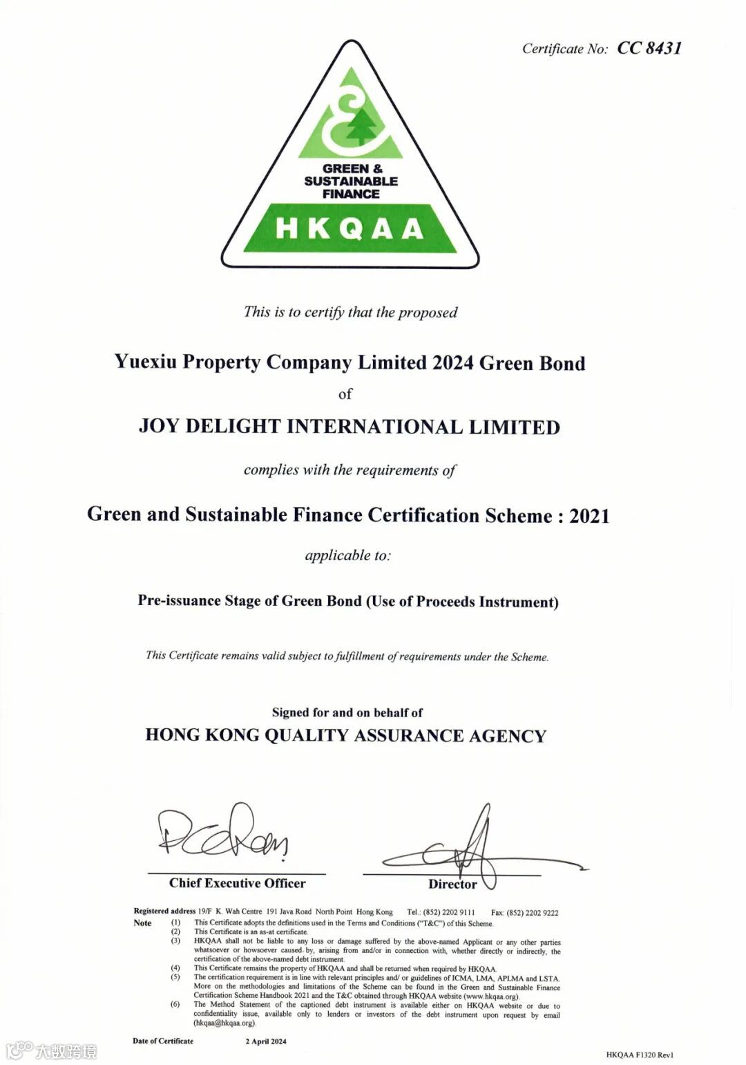 越秀地产于2024年7月5日成功发行16.90亿元离岸人民币点心债券,期限为3年,票面利率为4.10%。本次发行是越秀地产首单绿色债券发行,也是截至目前2024年地产行业最大规模的境外债券发行。该笔债券依照越秀地产可持续金融框架指引,其募集资金的等额资金将全部用于越秀地产合资格绿色项目,包括满足中国绿色建筑三星标准的绿色建筑等,此次绿色债券亦成功获得香港品质保证局绿色和可持续金融认证。