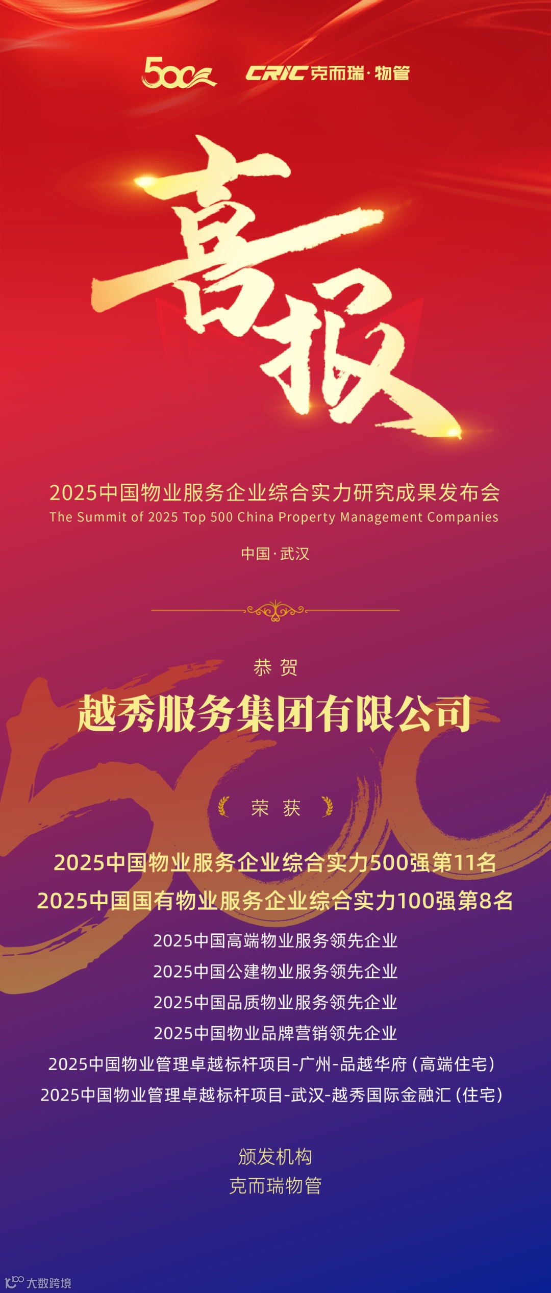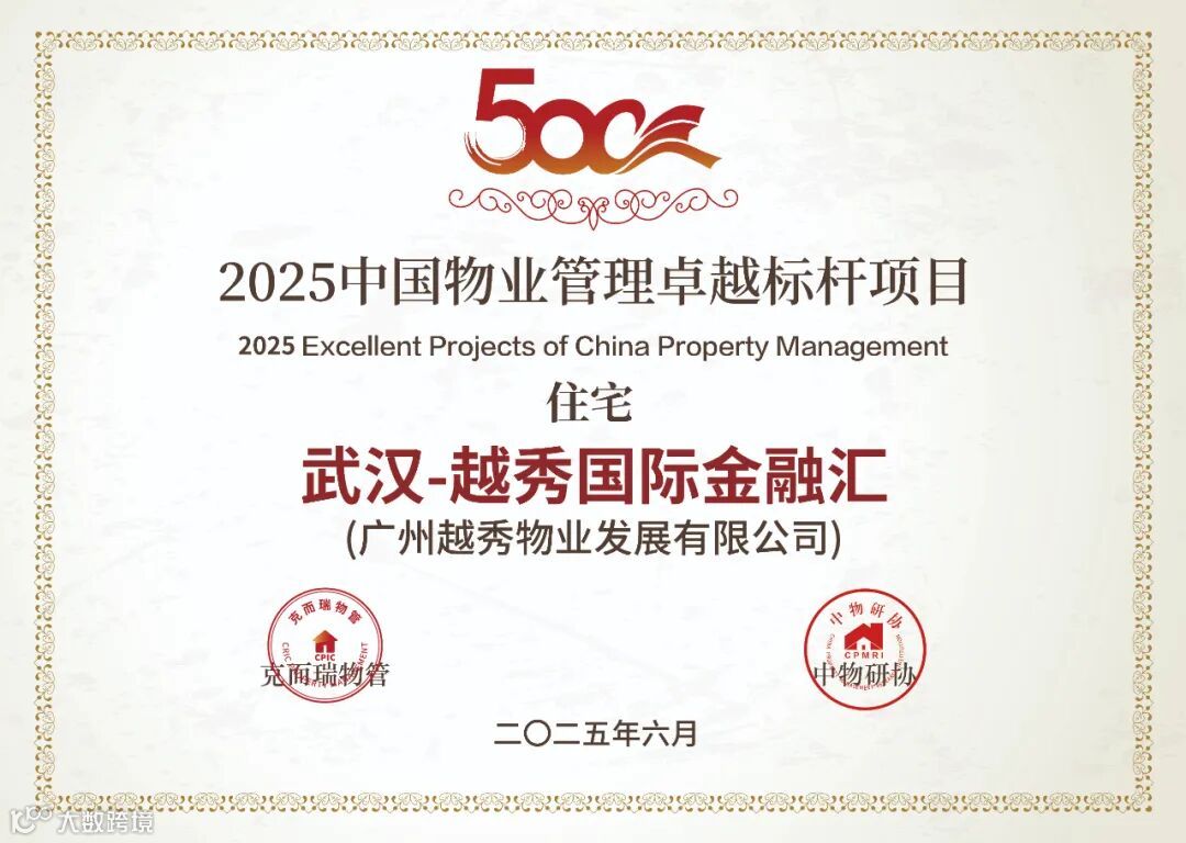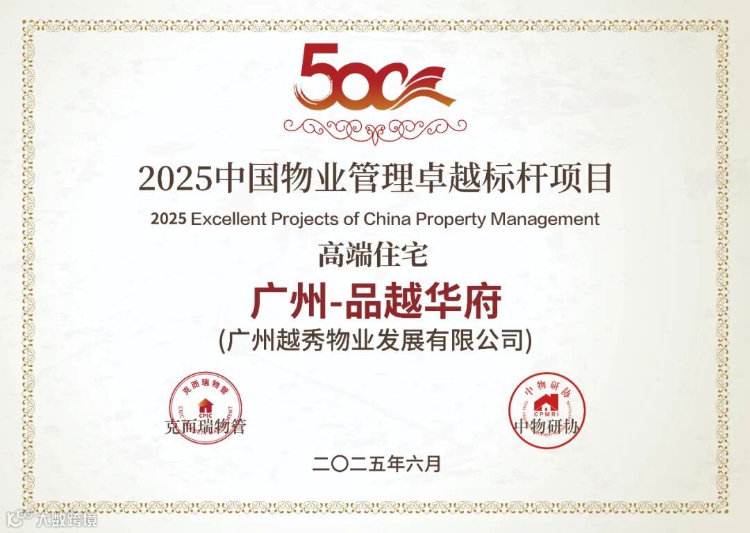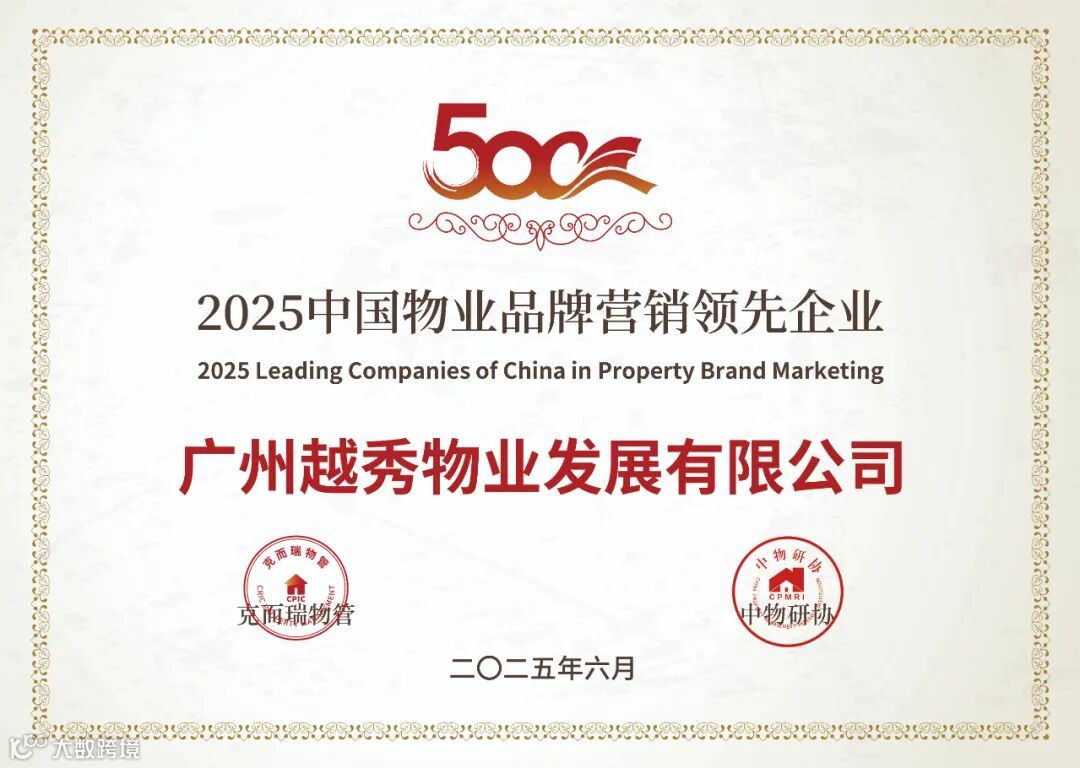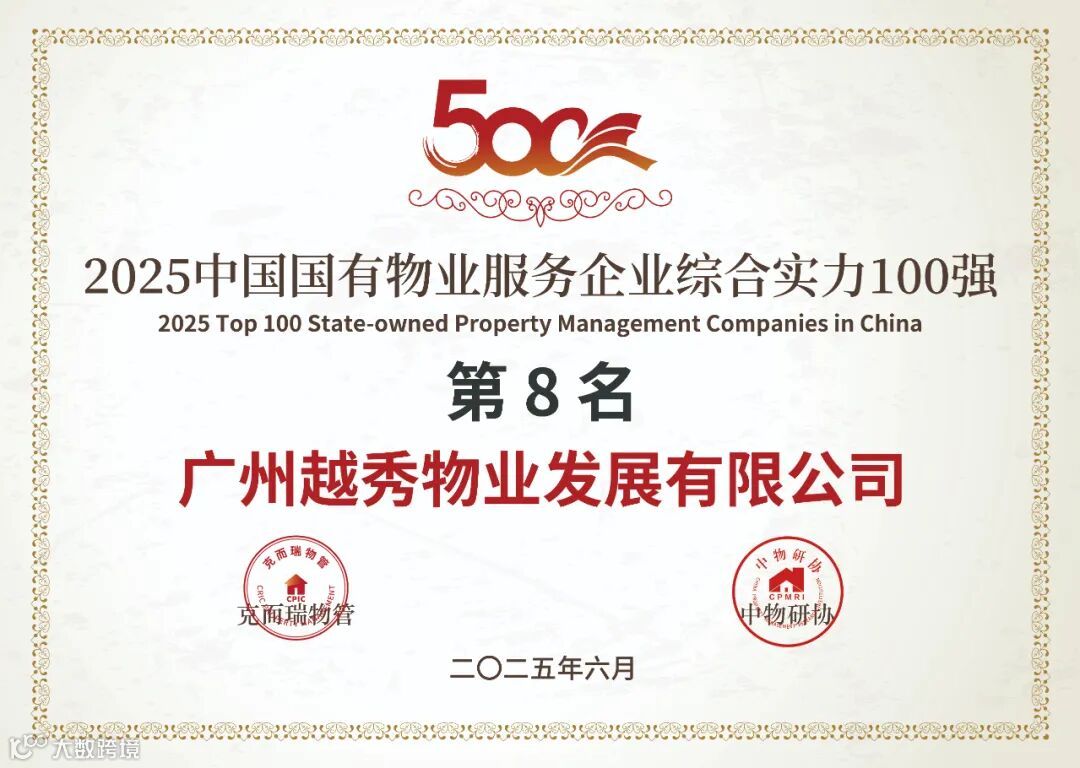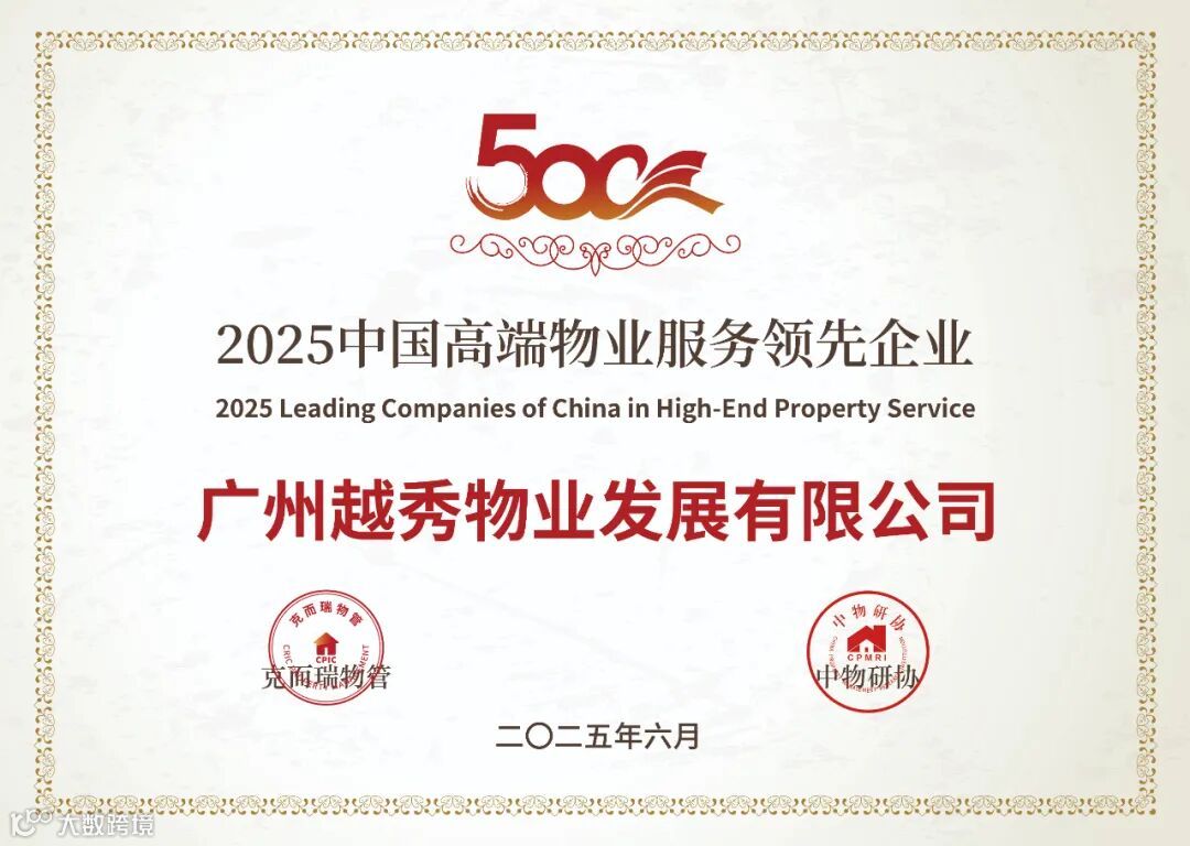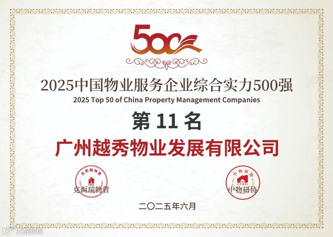 在「2025中国物业服务企业综合实力研究成果」中,越秀服务集团有限公司荣获“2025中国物业服务企业综合实力500强第11名”、“2025中国国有物业服务企业综合实力100强第8名”、“2025中国高端物业服务领先企业”、“2025中国公建物业服务领先企业”、“2025中国品质物业服务领先企业”、“2025中国物业品牌营销领先企业”、“2025中国物业管理卓越标杆项目-广州-品越华府(高端住宅)”、“2025中国物业管理卓越标杆项目-武汉-越秀国际金融汇(住宅)”奖项。