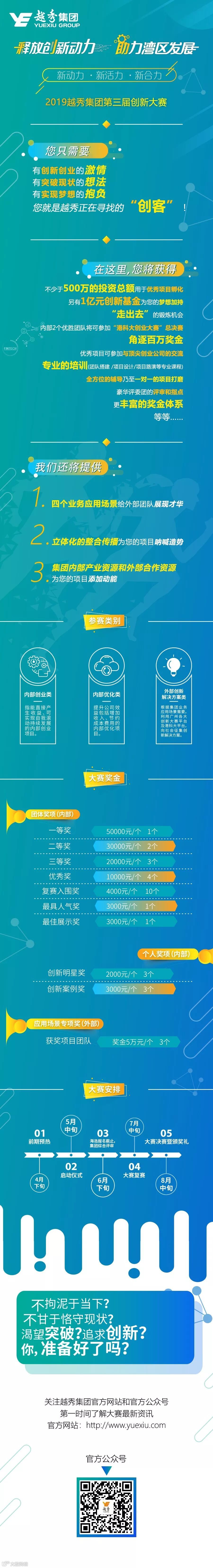 为积极拥抱粤港澳大湾区建设发展的历史性机遇,释放集团的创新、创业、创造动能,助力粤港澳大湾区发展,2019越秀集团第三届创新大赛即将盛大启动。大赛将通过汇聚创新资源力量,深度结合“香港科技大学百万奖金创业大赛”,挖掘、培育具有探索价值的优秀创新项目,全面推动形成创新开放、高质量发展的新格局。