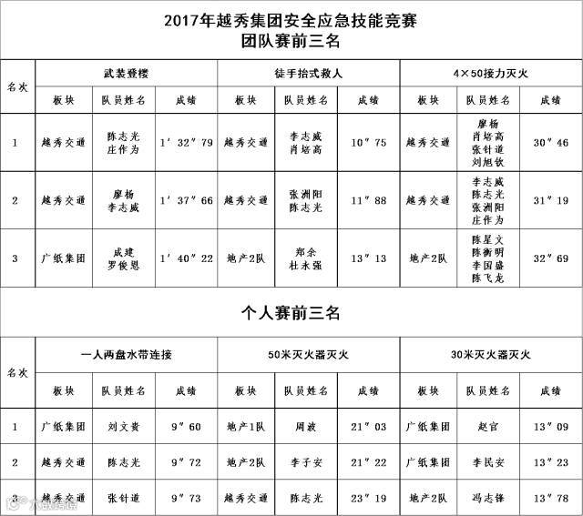 “越秀集团2017年安全应急技能竞赛”各竞赛项目得奖名单及成绩