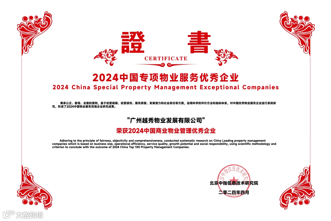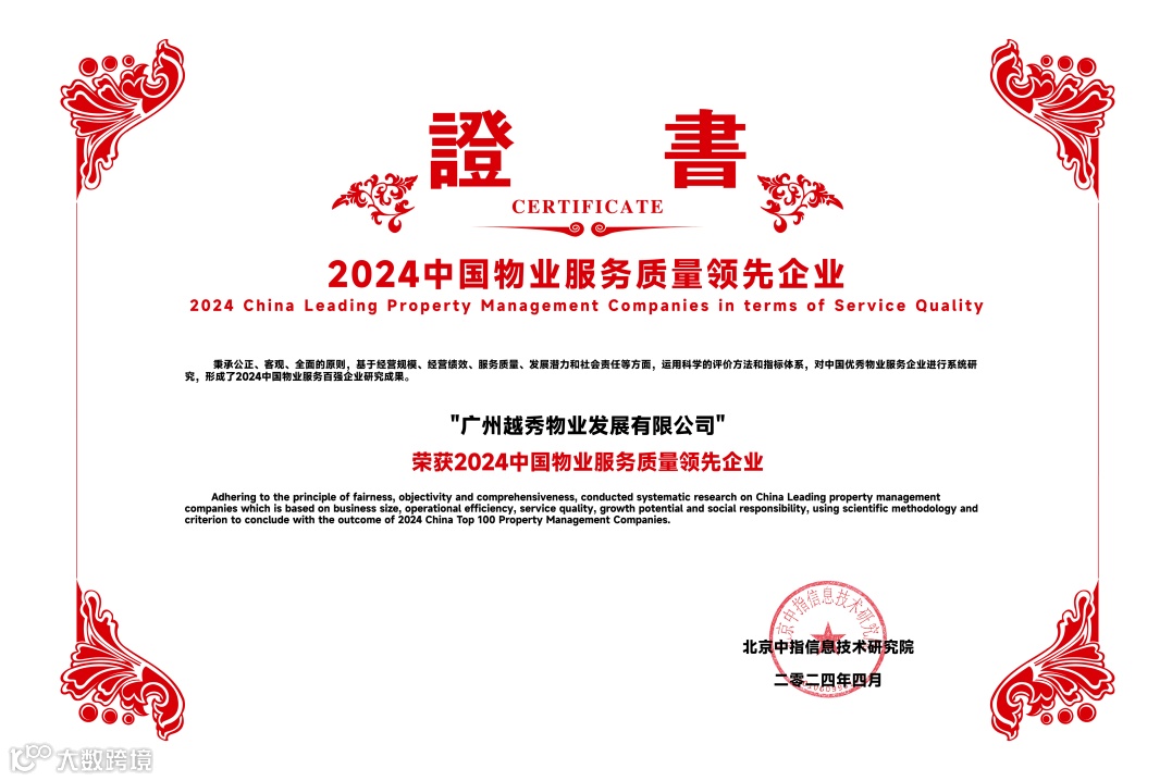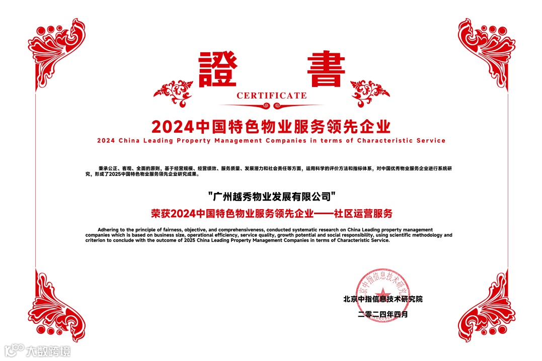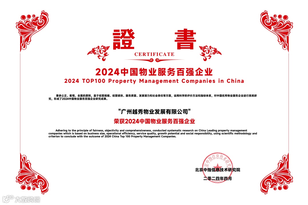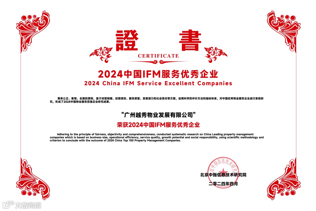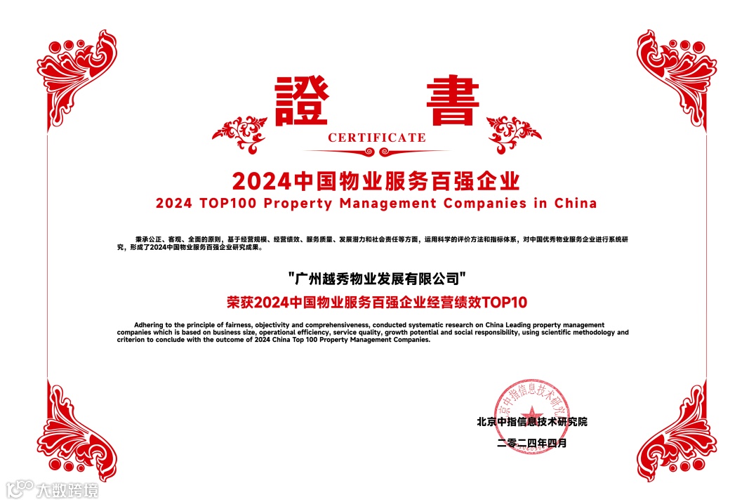 越秀服务凭借稳健的业绩增长、卓越的服务品质和强劲的综合实力,再度收获行业与市场的高度认可,荣膺“2024中国物业服务百强企业TOP12”等11个奖项。