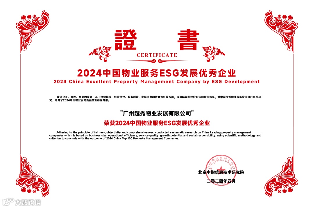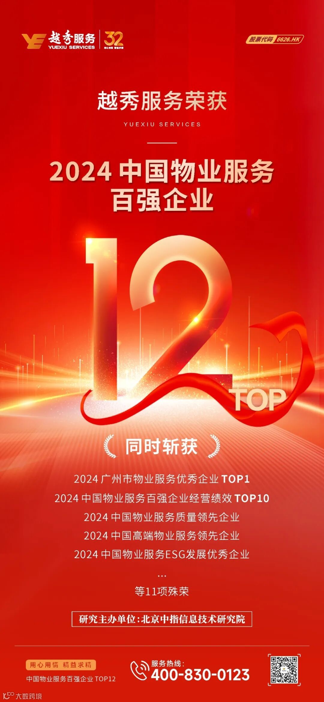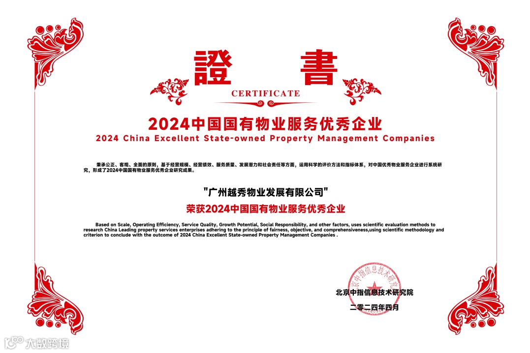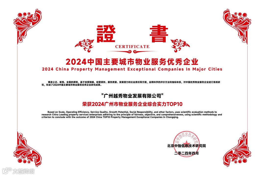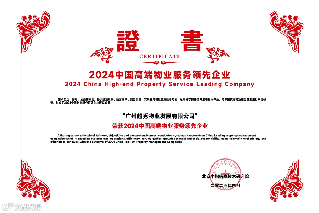 越秀服务凭借稳健的业绩增长、卓越的服务品质和强劲的综合实力,再度收获行业与市场的高度认可,荣膺“2024中国物业服务百强企业TOP12”等11个奖项。