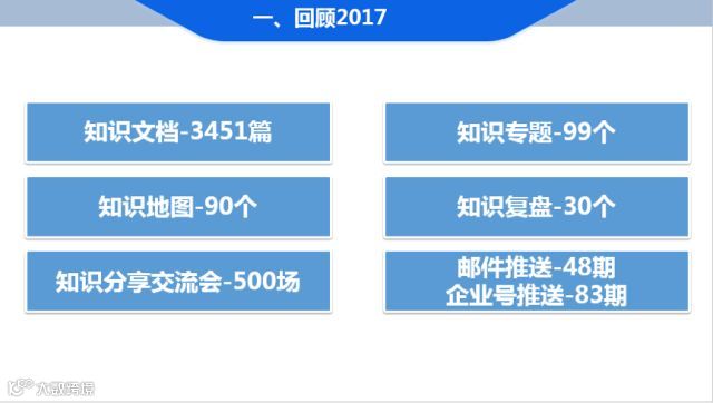 2017年,在集团及各板块共同努力下,知识管理取得丰硕成果。集团知识管理新增知识文档3451篇,建立知识专题99个,创建知识地图90个,完成知识复盘30个,举行超过500场知识分享交流会,全年坚持推送知识速递48期、微信企业号推送83期。
