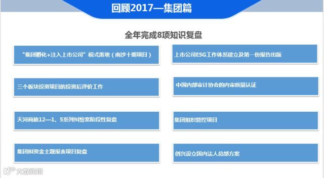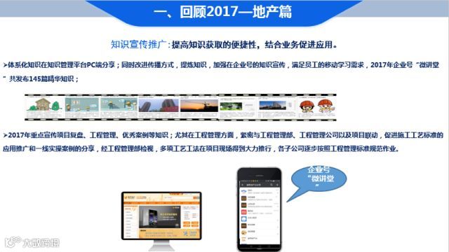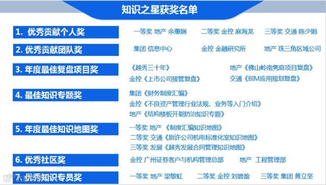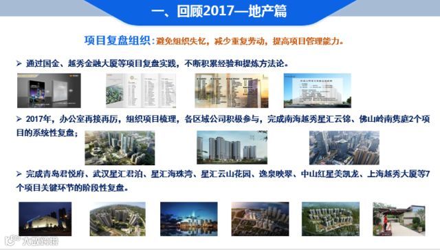 2017年,越秀地产知识管理工作围绕项目复盘组织、核心知识传承和知识宣传推广三大亮点展开,全年完成9项知识复盘。