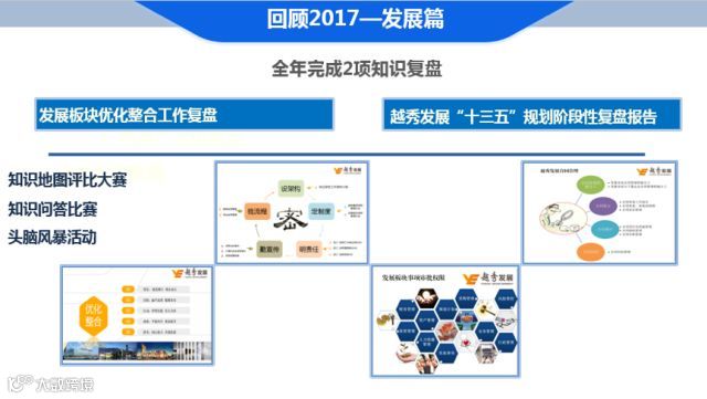 2017年,越秀发展完成2项知识复盘,初步搭建起KM线上系统,举行了知识地图评比大赛、知识考试、专题培训、头脑风暴等活动。