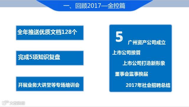 2017年,越秀金控分享和推送优质金融类文档128个、知识复盘5项;开展业务大讲堂等专场培训会,邀请来自四大资产管理公司的多位专家、学者进行分享和交流。