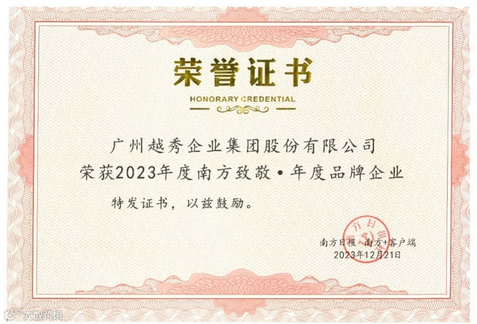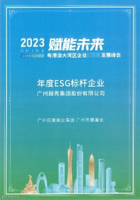 2023年12月21日,由广州市民政局、广州市商务局、广州市协作办指导,广州日报报业集团主办,广州市工商联支持,广州市慈善会、广报文化、粤传媒承办,商道纵横提供学术支持的“赋能未来·2023粤港澳大湾区企业ESG 发展峰会”在广州报业文化中心举办。会上,2023广州市慈善榜、2023广州市慈善报告、2023粤港澳大湾区企业ESG系列奖项、《2023粤港澳大湾区企业ESG发展报告》以及年度特别贡献集体/企业奖项等多项报告和奖项集中发布。越秀集团荣获2023年度广州慈善榜样五星捐赠单位、特别贡献企业、ESG标杆企业,越秀集团公益基金会荣获2023年度广州慈善榜样五星慈善单位。
