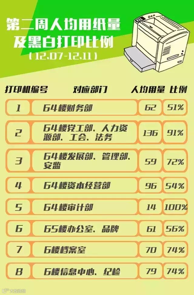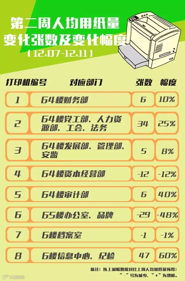 对比上周数据,本周的彩色打印量大幅减少,5个部门的人均用纸量增加。